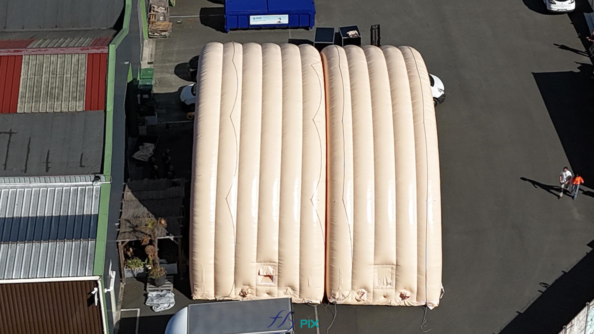 Une autre vue plongeante, de dessus, qui montre le hangar gonflable militaire de dimensions L = 25 m x l = 14 m x H = 7 m, et de surface intérieure utile S = 350 m2. C'est une grande tente gonflable en enveloppe PVC 0.45 mm double peau capitonnée. - Copyright : Vivien LAÏLLE/FLYPIX, droits réservés.