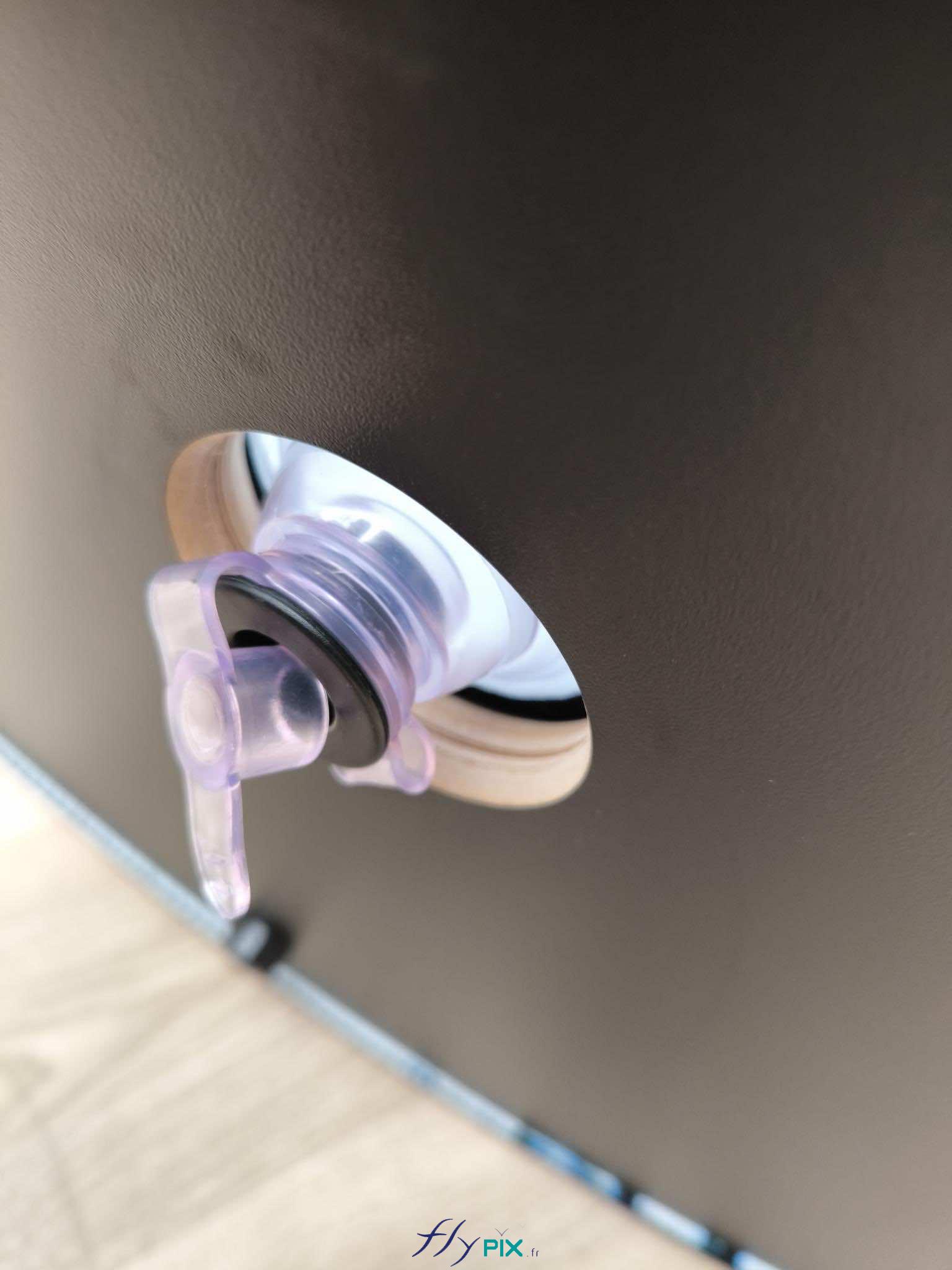 Vue détaillée de la valve anti-retour, qui permet le gonflage à l'air de la structure gonflable air captif, avec une pompe électrique, incluse dans le kit.