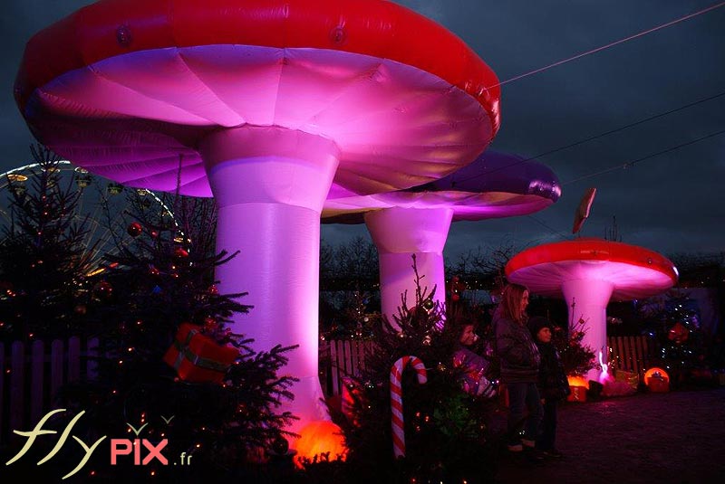 La création d'un univers magique et féérique grâce à l'utilisation de structures gonflables rigides de formes personnalisées sur mesure. Voici un bel exemple de ballons en forme de champignon. Ces structures gonflables sont ici éclairées par des spots lumineux dont les couleurs varient en fonction du temps, créant ainsi un effet visuel époustouflant et merveilleux, convenant très bien à une ambiance de fête de Noël. Effets garantis auprès des enfants.