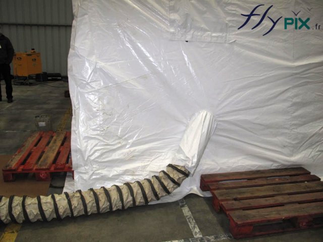 Les secteurs de l'industrie, de la chimie, de l'environnement et et l'aéronautique sont demandeuses de structures gonflables pour la réalisation de tentes, d'abris ou de cabines. Ici, un exemple de cabine gonflable conçue pour un poste temporaire d'application et de pose de peinture dans une usine. Au premier plan, il est possible de voir la turbine électrique 220 V utilisée pour le gonflage de la tente avec de l'air.