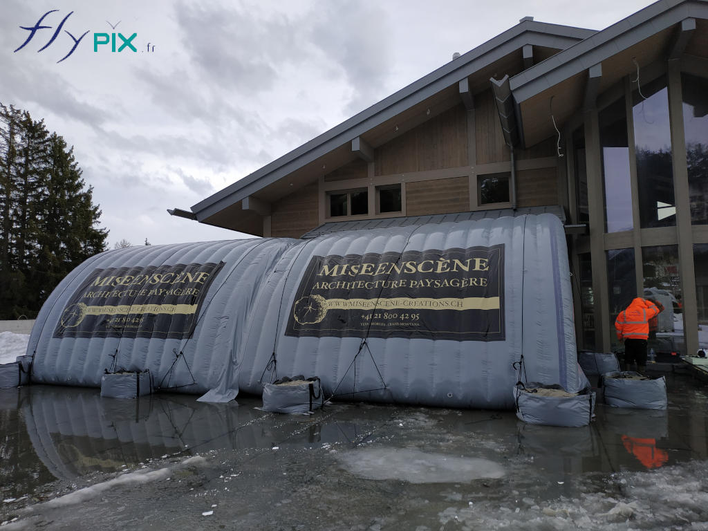 Résumé: Réalisation en décembre dernier d'un abri gonflable de chantier en 2 modules, air captif, gonflé avec une pompe électrique. Ceux-ci ont été déployés en environnement montagneux, en Suisse, en plein hiver, pour protéger des chantiers en extérieur.