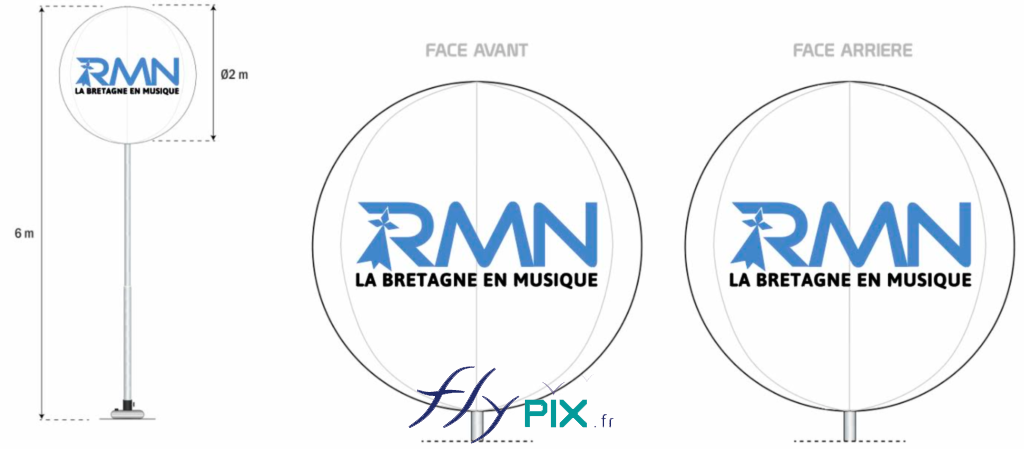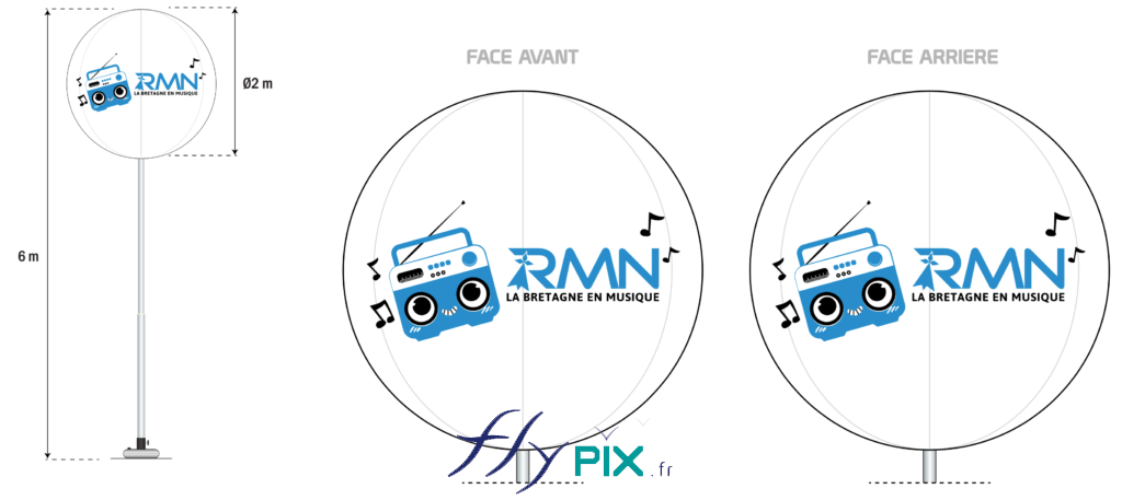 Résumé : La radio bretonne RMN nous a demandé de fabriquer sur mesure un ballon sphérique imprimé, monté sur un mat télescopique. Cette publicité gonflable, personnalisée avec une impression de leur logo en couleur recto/verso sur 2 faces, sur un fond blanc, a été déployée en environnement extérieur, sans vent, pendant un événement de courte durée. Cette structure gonflable est en enveloppe PVC 0.18 mm simple peau, air captif, gonflée à l'air avec une pompe électrique.